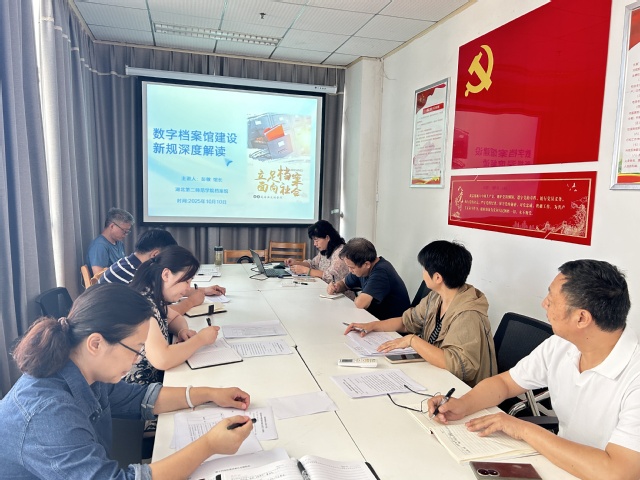 本网讯(通讯员 施晴)10月10日,档案馆集中学习国家档案局印发的《推进数字档案馆建设实施办法(试行)》,馆长彭敏主讲,全体馆员参加。